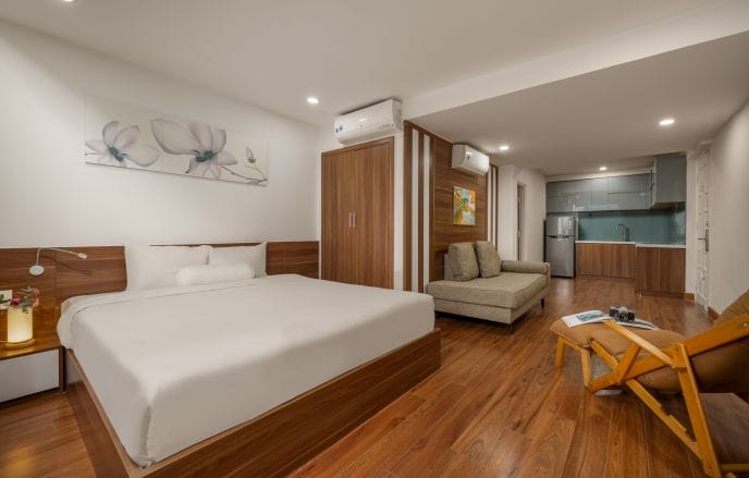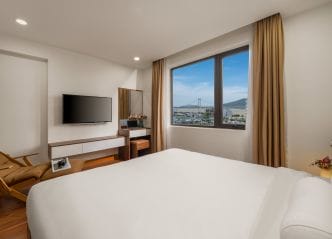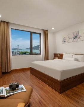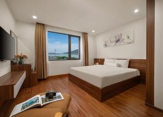Deluxe Studio Room sở hữu không gian rộng với khu bếp và bàn ăn riêng, phù hợp cho kỳ nghỉ dài ngày hoặc khách thích tự nấu nướng. Cửa sổ lớn hướng city view, một số phòng ở tầng cao có thể nhìn ra biển vịnh Đà Nẵng hoặc cầu Thuận Phước, mang đến trải nghiệm vừa tiện nghi vừa thư thái.