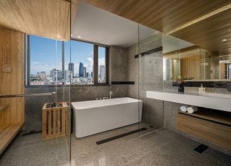 Master Room with Panorama View là hạng phòng sang trọng bậc nhất của Rest Hotel & Apartment, với cửa sổ góc siêu lớn cho tầm nhìn 270° ôm trọn biển, cầu Thuận Phước và sông Hàn. Phòng được trang bị phòng xông hơi, bồn tắm, WC và phòng tắm riêng, cùng nội thất tiêu chuẩn Nhật Bản, mang đến trải nghiệm nghỉ dưỡng đẳng cấp.